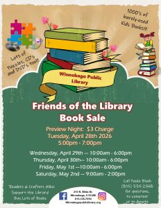 The Friends of the Winnebago Public Library is an organization that raises funds to provide gifts (programs, materials, equipment) for the library. The Friends sponsor two yearly used book sales. They’ve raised and distributed more than $50,000 for library materials, programming, equipment, and furniture and for scholarships for library district students.